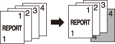 Back Cover + Print (Simplex or Duplex) | 1-sided copy ([2->1]/[1->1]): The last page of a 1-sided or 2-sided original is copied on a single side of the back cover sheet. For [1->2]: The 1st and 2nd pages of a 1-sided original are respectively copied on the front and back sides of the front cover sheet regardless of the cover print setting. If [Simplex] is selected for cover printing, the last page of a 1-sided original is copied on a single side of the back cover sheet. If [Duplex] is selected when the original has an even number of pages, the last 2 pages of the original are copied on both sides of the back cover sheet. For [2->2]: The last page of a 2-sided original is duplex-copied on the back cover sheet. A back cover cannot be simplex-copied. ![]() |