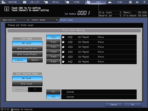 Touch panel - [COPY] - [Application] - [Insert Sheet] - [Change Set] of [Front Cover Setting]