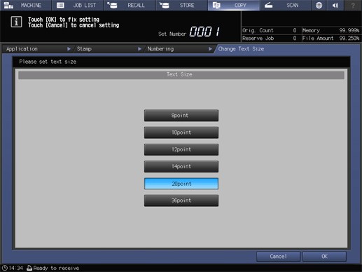 Screen access | Touch panel - [COPY] - [Application] - [Stamp] - [Set Numbering] ([Preset Stamp]) | ||