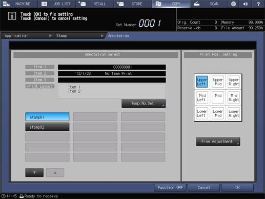 Touch panel - [SCAN] - [Scan Settings] - [Application] - [Annotation] | |||