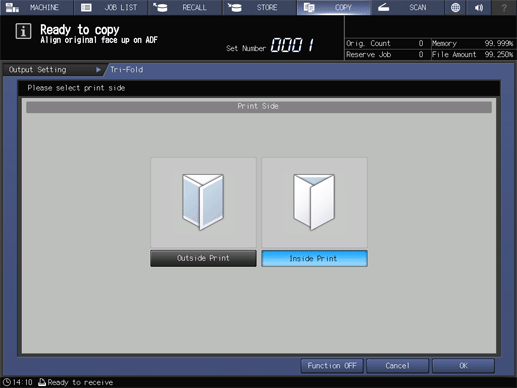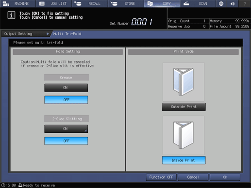 Touch panel - [COPY] - [Output Setting] - [Multi 3-Fold]
