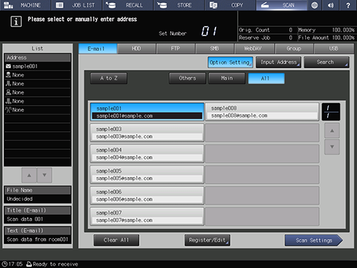 [Clear All] | Resets the selected address. When multiple addresses are selected using certain sending methods, they can be canceled collectively. | ||