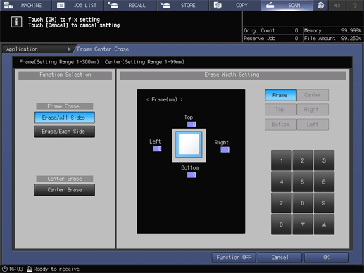 Touch panel - [SCAN] - Select a destination. - [Scan Settings] - [Application] - [FrameCenterErase]