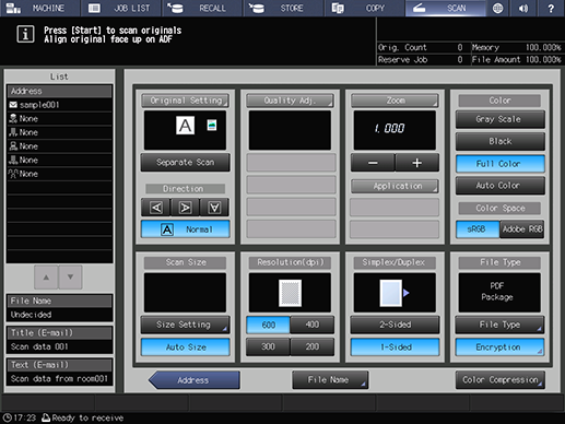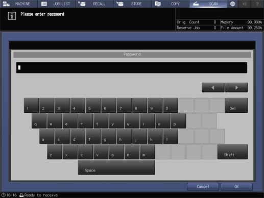 Screen access | Touch panel - [SCAN] - Select a destination. - [Scan Settings] - [Encryption] | ||