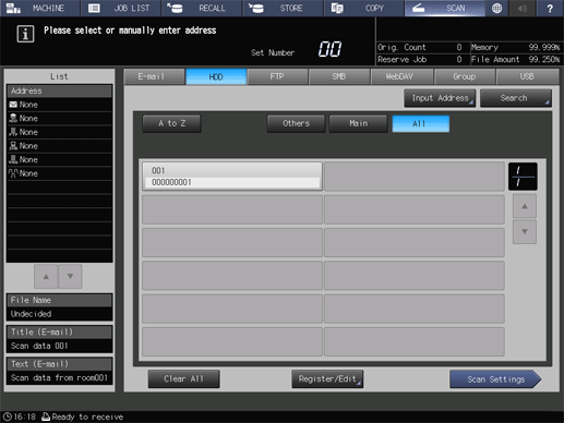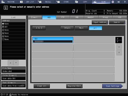 Screen access | Touch panel - [SCAN] - [HDD] | ||