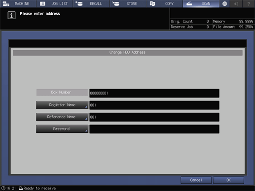 Touch panel - [SCAN] - [HDD] - [Register/Edit] - Select an address. - [Change]