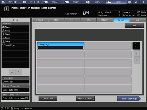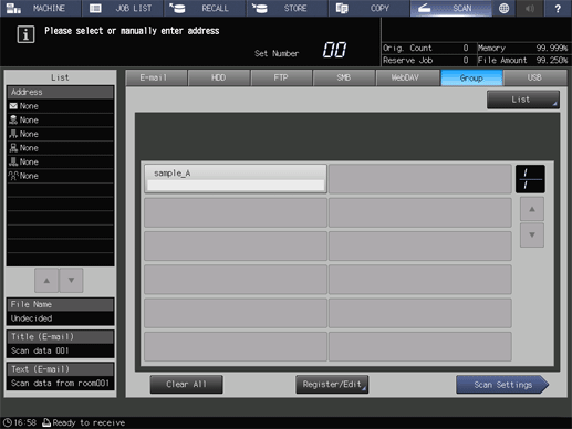 Screen access | Touch panel - [SCAN] - [Group] | ||