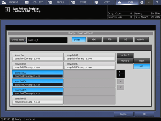 Screen access | Touch panel - [SCAN] - [Group] - Select a group destination. - [List] - [Edit] | ||