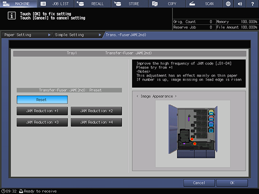 Touch panel - [MACHINE] - [Paper Setting] - [Simple Setting] - [Transfer-Fuser JAM(2nd)]