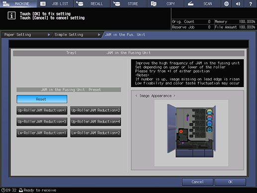 Touch panel - [MACHINE] - [Paper Setting] - [Simple Setting] - [JAM in the Fusing Unit]