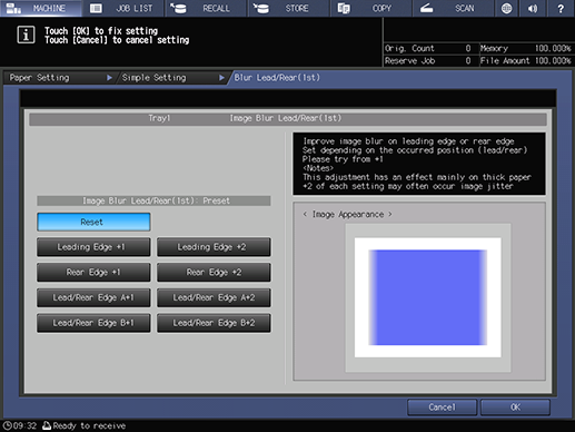 Touch panel - [MACHINE] - [Paper Setting] - [Simple Setting] - [Image Blur Lead/Rear(1st)]