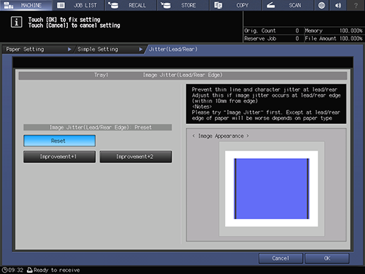 Touch panel - [MACHINE] - [Paper Setting] - [Simple Setting] - [Image Jitter(Lead/Rear Edge)]