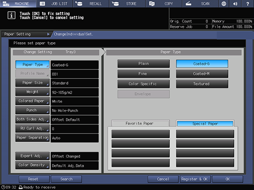 Touch panel - [MACHINE] - [Paper Setting] - [Register] - [Paper Type] | |||