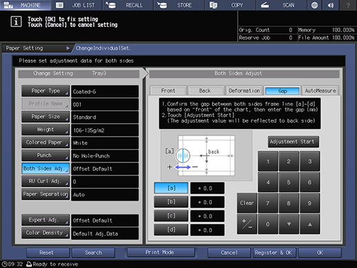 Touch panel - [MACHINE] - [Paper Setting] - [New Setting] - [Both Sides Adj.] - [Gap] | |||