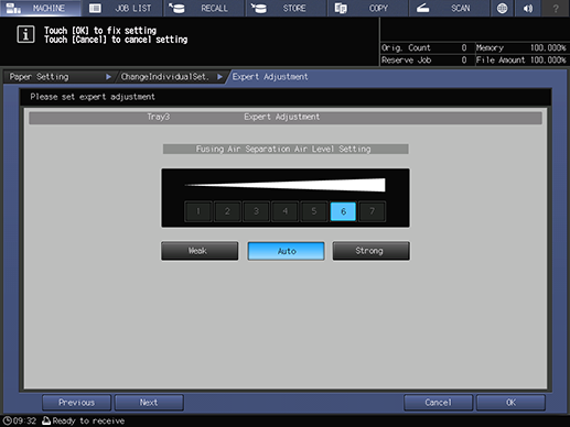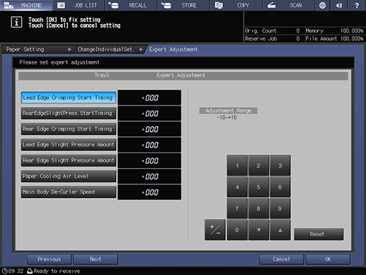 Touch panel - [MACHINE] - [Paper Setting] - [Change Set] - [Expert Adj.]