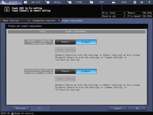 Touch panel - [MACHINE] - [Paper Setting] - [New Setting] - [Expert Adj.]