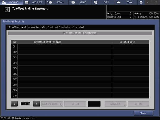 Touch panel - [MACHINE] - [Paper Setting] - [Change Set] - [TU OffsetProfile] - [TU Offset Profile Management]