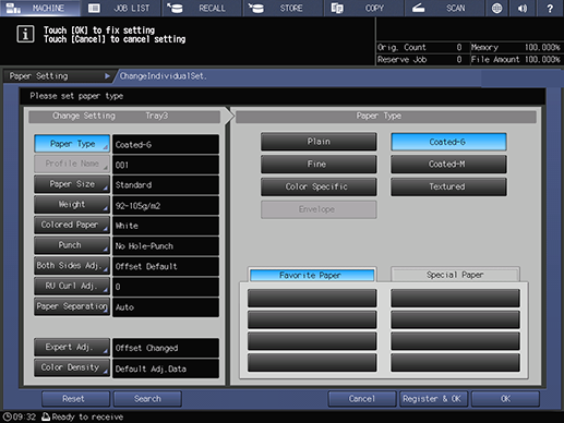 Touch panel - [MACHINE] - [Paper Setting] - [Register] - [Paper Type] | |||