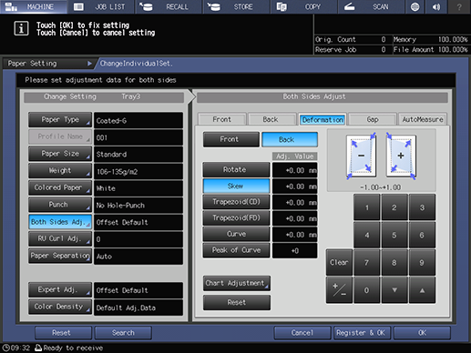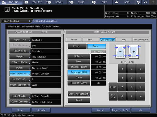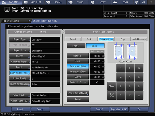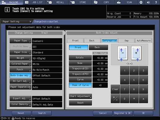 Touch panel - [MACHINE] - [Reg./Del.PaperSet.] - [Add/Edit] - [Both Sides Adj.] - [Deformation] | ||||