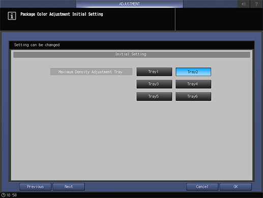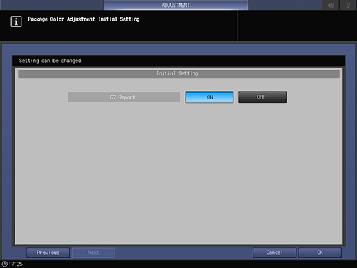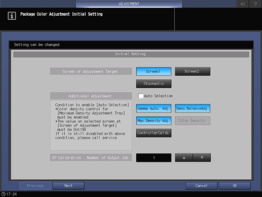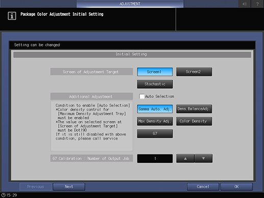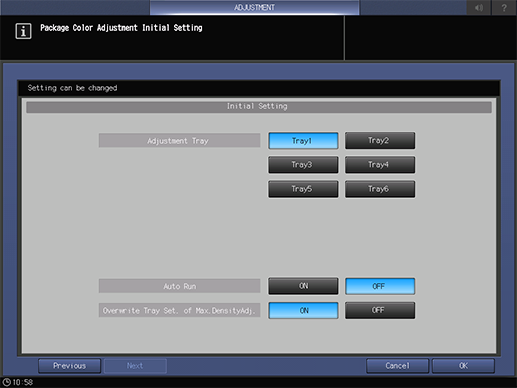 Touch panel - [MACHINE] - [Adjustment] - [Quality Adjustment] - [Package Color Auto Adj.] - [Initial Set.]