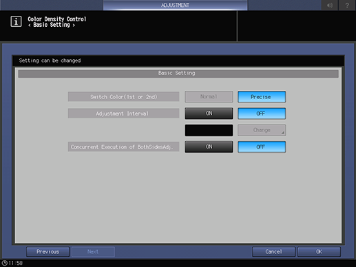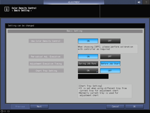 Touch panel - [MACHINE] - [Adjustment] - [Quality Adjustment] - [Color Density Control] - [Basic Setting]