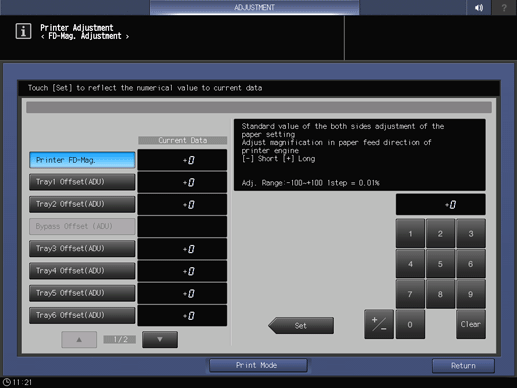 Control panel - Utility/Counter - [Administrator Setting] - [System Setting] - [Expert Adjustment] - [Printer Adjustment] - [FD-Mag. Adjustment] | |||