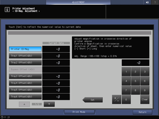 Control panel - Utility/Counter - [Administrator Setting] - [System Setting] - [Expert Adjustment] - [Printer Adjustment] - [CD-Mag. Adjustment] | |||
