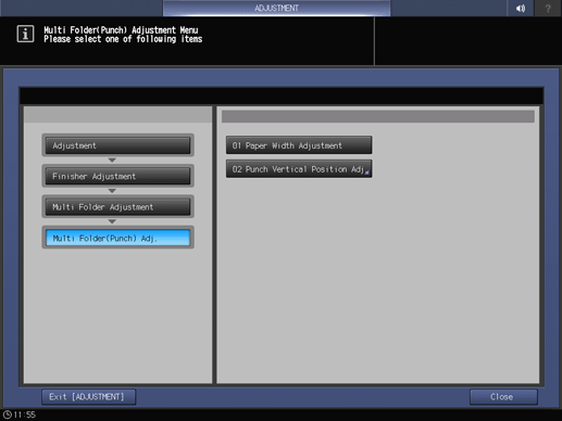 Touch panel - [MACHINE] - [Adjustment] - [Finisher Adjustment] - [Multi Folder Adjustment] - [Multi Folder(Punch) Adj.]