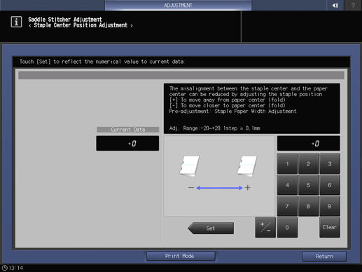 Screen access | Touch panel - [MACHINE] - [Adjustment] - [Finisher Adjustment] - [Saddle Stitcher Adjustment] - [Staple Center Position] | ||