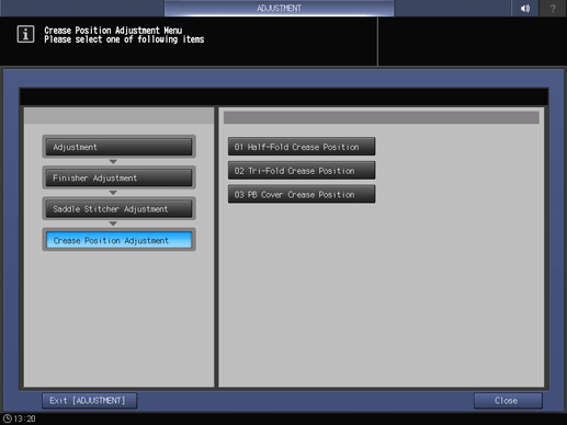 Touch panel - [Adjustment] - [Finisher Adjustment] - [Saddle Stitcher Adjustment] - [Crease Position Adjustment]