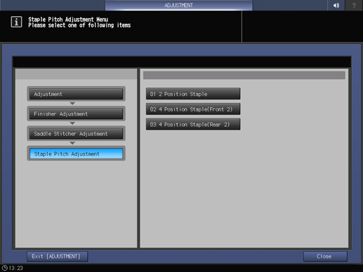 Touch panel - [MACHINE] - [Adjustment] - [Finisher Adjustment] - [Saddle Stitcher Adjustment] - [Staple Pitch Adjustment]