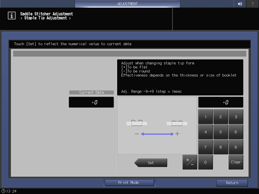 Screen access | Touch panel - [MACHINE] - [Adjustment] - [Finisher Adjustment] - [Saddle Stitcher Adjustment] - [Staple Tip Adjustment] | ||