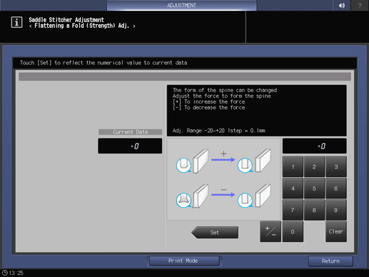 Screen access | Touch panel - [MACHINE] - [Adjustment] - [Finisher Adjustment] - [Saddle Stitcher Adjustment] - [Flattening a Fold (Strength)] | ||
