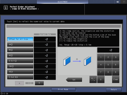Control panel - Utility/Counter - [Administrator Setting] - [System Setting] - [Expert Adjustment] - [Finisher Adjustment] - [Perfect Binder Adjustment] - [Clamp CD Width Adjustment] | |||