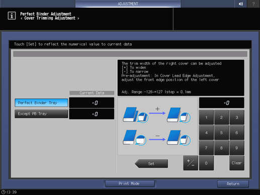 Control panel - Utility/Counter - [Administrator Setting] - [System Setting] - [Expert Adjustment] - [Finisher Adjustment] - [Perfect Binder Adjustment] - [Cover Trimming Adjustment] | |||