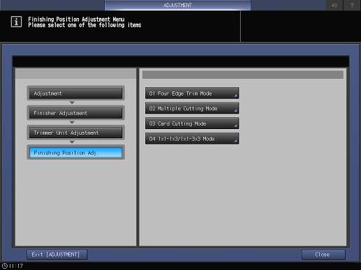 Touch panel - [MACHINE] - [Adjustment] - [Finisher Adjustment] - [Trimmer Unit Adjustment] - [Finishing Position Adj.]