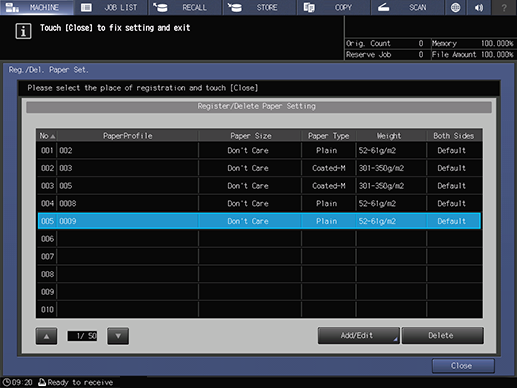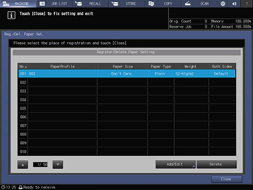 If no line is selected, the new paper profile is registered in the unregistered line with the small No.