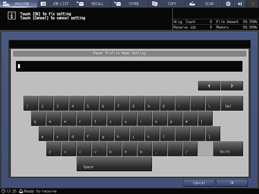 - If you pushed [New Store] in step 8, the [Profile Name] screen is displayed. Edit the paper profile name and press [OK] to register the new paper profile in the unregistered line with the small No. This is useful when you want to create paper profiles of a similar type.
