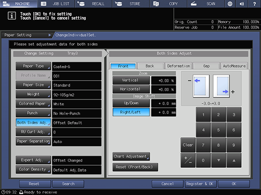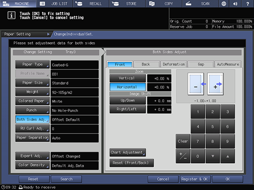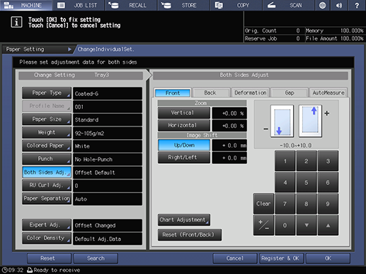 Touch panel - [MACHINE] - [Reg./Del.PaperSet.] - [Add/Edit] - [Both Sides Adj.] - [Front] | ||||