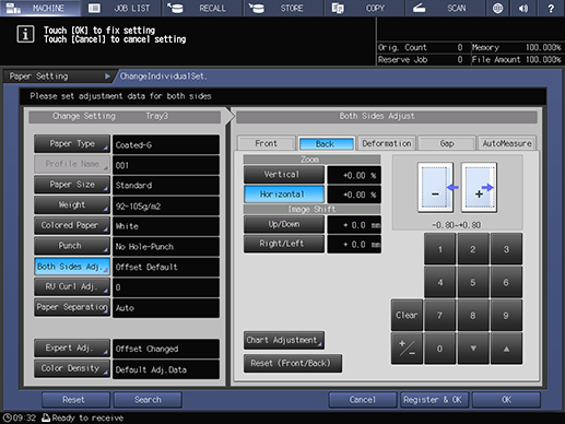 Touch panel - [MACHINE] - [Paper Setting] - [Change Set] - [Both Sides Adj.] - [Back] | ||||