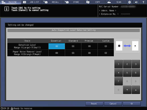 Screen access | Touch panel - [MACHINE] - [Paper Setting] - [Change Set] - [Expert Adj.] - [Auto Inspection Level Detailed Setting] | ||||