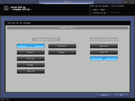 Control panel - Utility/Counter - [User Setting] - [System Setting] - [Language Setting]