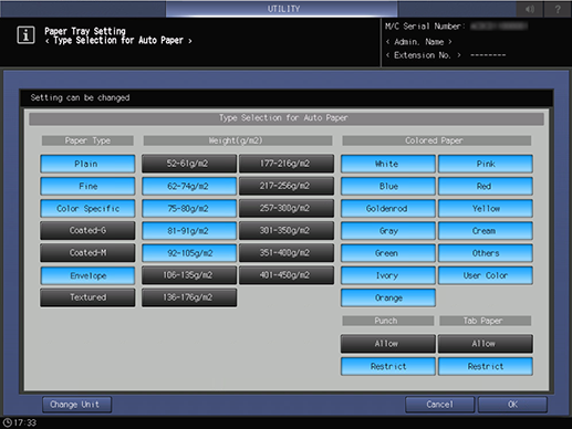 Control panel - Utility/Counter - [User Setting] - [System Setting] - [Paper Tray Setting] - [Type for Auto Paper]