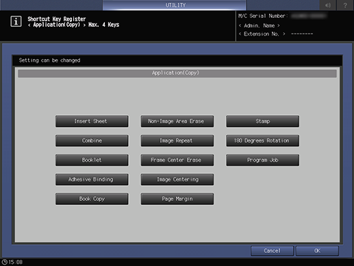 Screen access | Control panel - Utility/Counter - [User Setting] - [System Setting] - [Shortcut Key Register] - [Application(Copy)] | ||