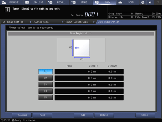Touch panel - [COPY] - [Original Setting] - [Custom] - [Input Size] - [Size Registration]