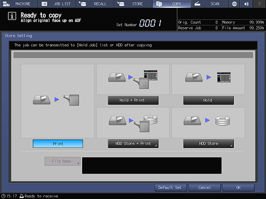 [HDD Store + Print] | Stores data scanned from the ADF or Original glass in the HDD, and simultaneously prints it. For details, refer to [Store Setting]. | ||