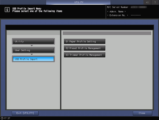 Control panel - Utility/Counter - [User Setting] - [USB Profile Import]