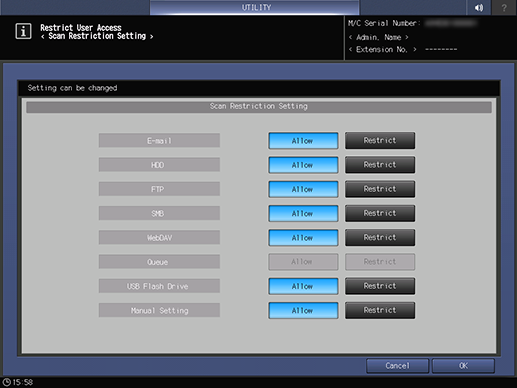 Control panel - Utility/Counter - [Administrator Setting] - [System Setting] - [Restrict User Access] - [Scan Restriction Setting]
