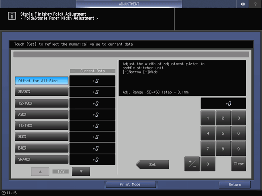 Control panel - Utility/Counter - [Administrator Setting] - [System Setting] - [Expert Adjustment] - [Finisher Adjustment] - [Staple Finisher Adjustment] - [Staple Finisher(Fold) Adj.] - [Fold&Staple Paper Width Adj.] | |||