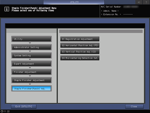 Control panel - Utility/Counter - [Administrator Setting] - [System Setting] - [Expert Adjustment] - [Finisher Adjustment] - [Staple Finisher Adjustment] - [Staple Finisher(Punch) Adj.]